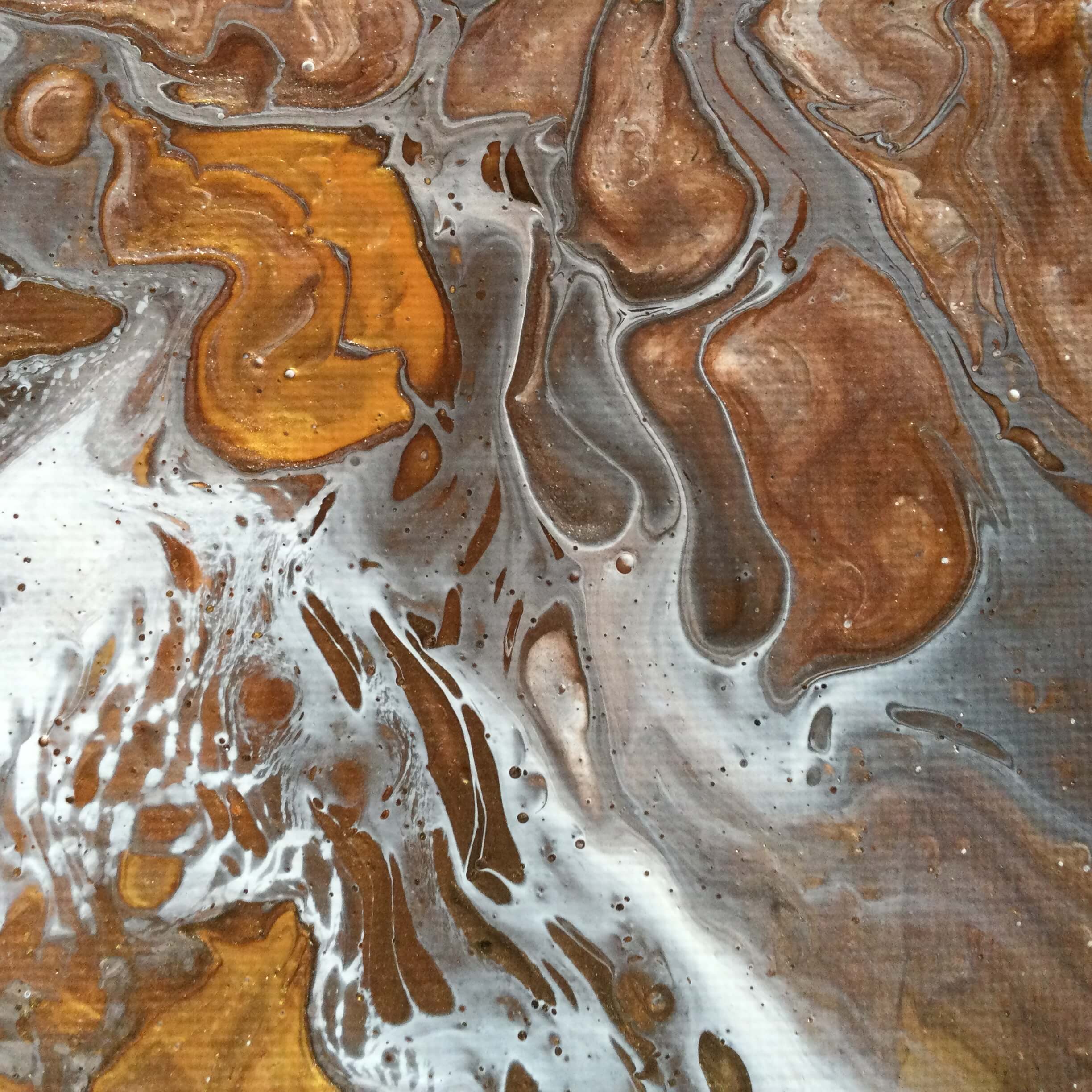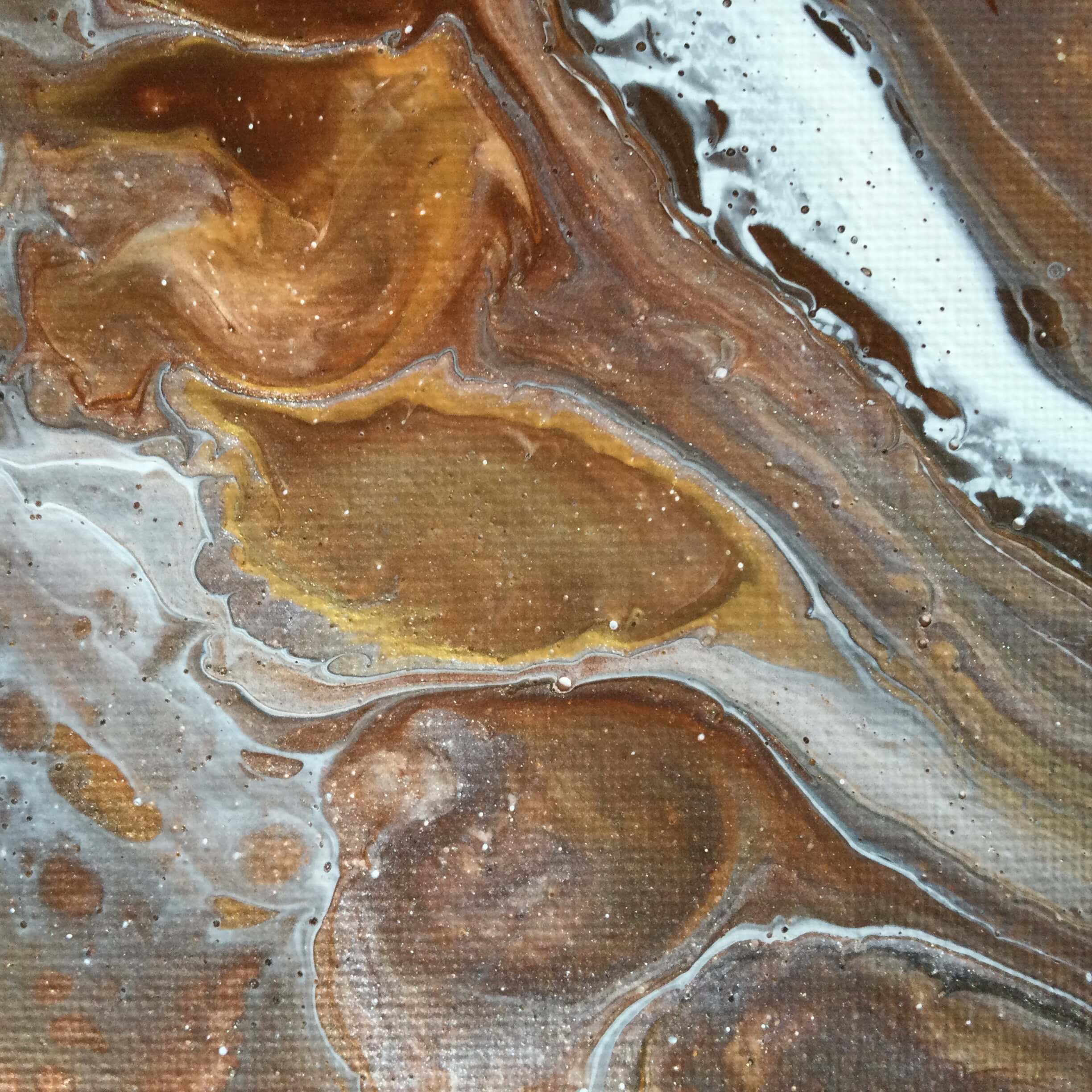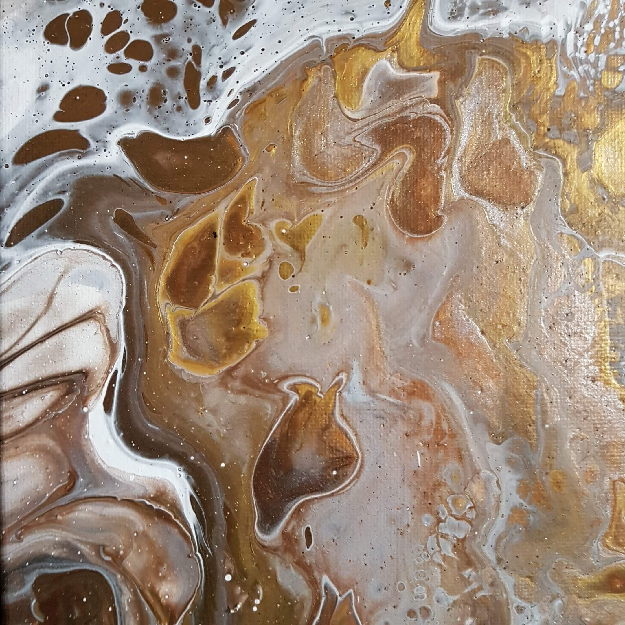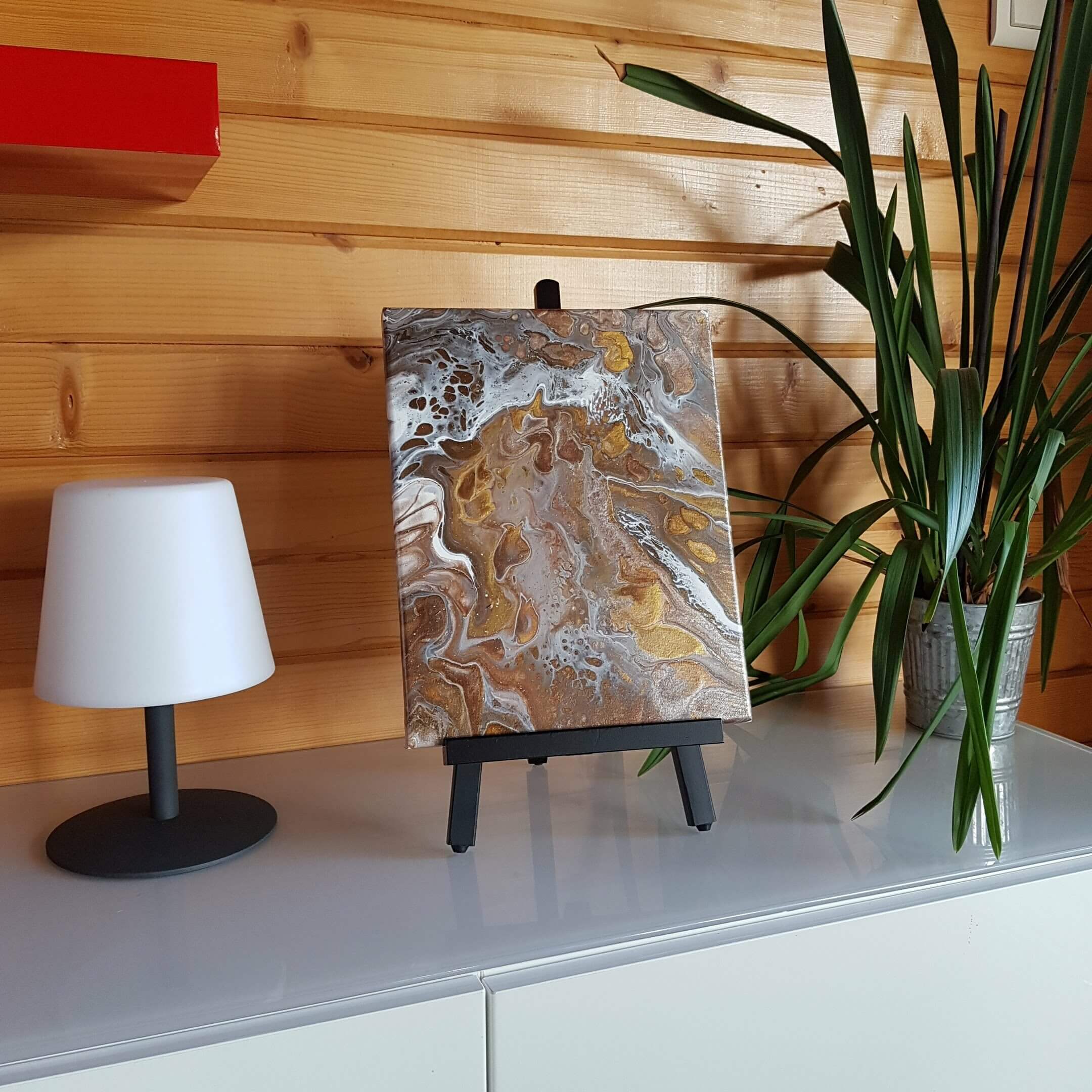 Réalisée en technique de pouring, cette œuvre mêle avec douceur les pigments acryliques pour créer un tourbillon de bruns, d’or et de blanc. Les mouvements fluides évoquent une matière en fusion, presque minérale, qui invite à la contemplation. Les nuances chaudes diffusent une sensation de profondeur et de mystère. Pièce unique peinte sur toile coton, elle s’intègre facilement dans un intérieur chaleureux. Son format 24×30 cm permet de l’exposer aussi bien sur un mur que sur un meuble.