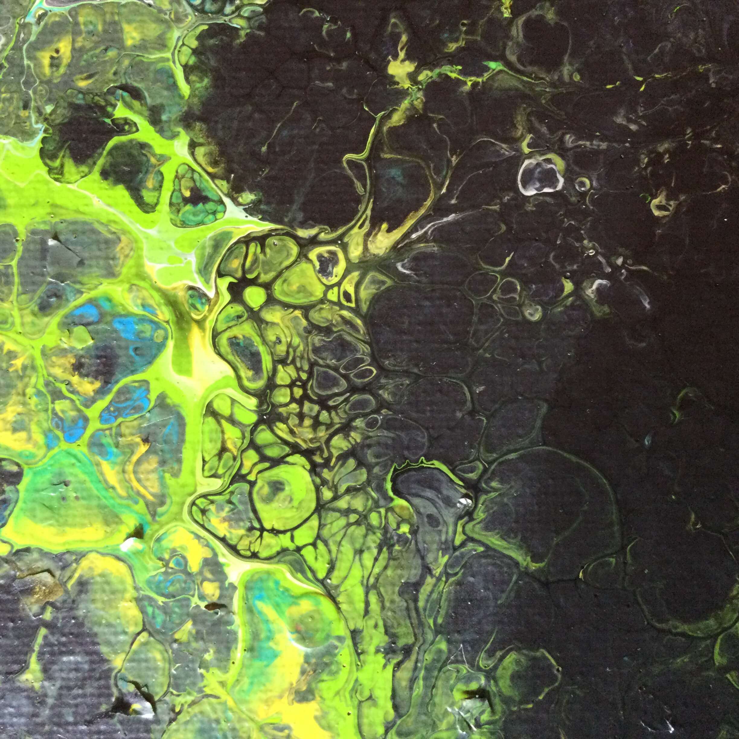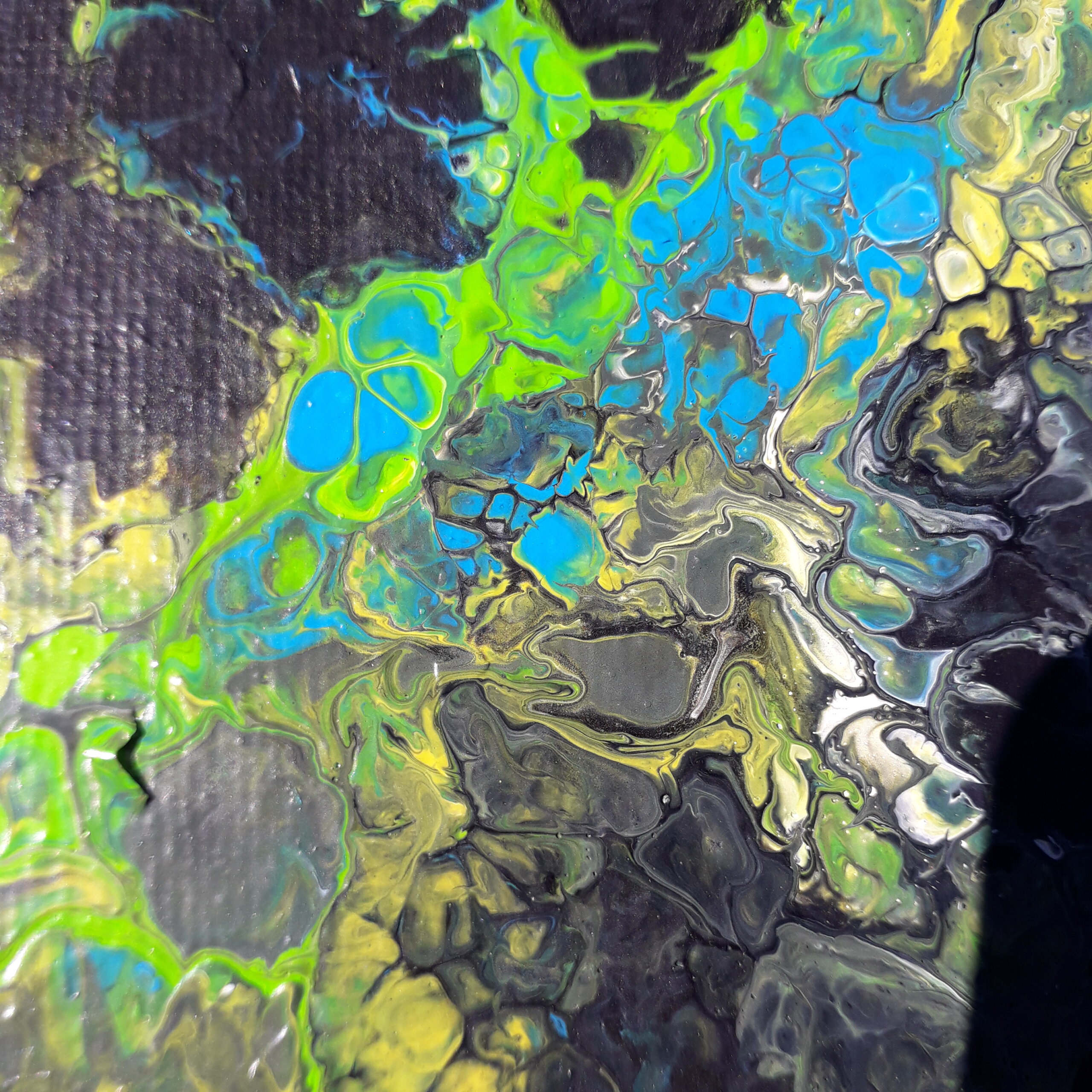 Réalisée avec la technique du pouring, cette peinture acrylique sur toile coton évoque une île lumineuse émergeant d’un océan profond et mystérieux. Une diagonale de verts intenses, de jaune électrique et de touches bleutées traverse la surface sombre, créant l’illusion d’une terre vivante et vibrante. Les cellules et textures fines apportent un aspect organique, presque minéral, comme un paysage vu du ciel. Grâce à son format 30×24 cm, cette œuvre s’intègre parfaitement dans un intérieur moderne, sur une étagère, un bureau ou en composition murale. Chaque détail reflète la spontanéité et la magie propre au pouring, rendant cette pièce totalement unique.