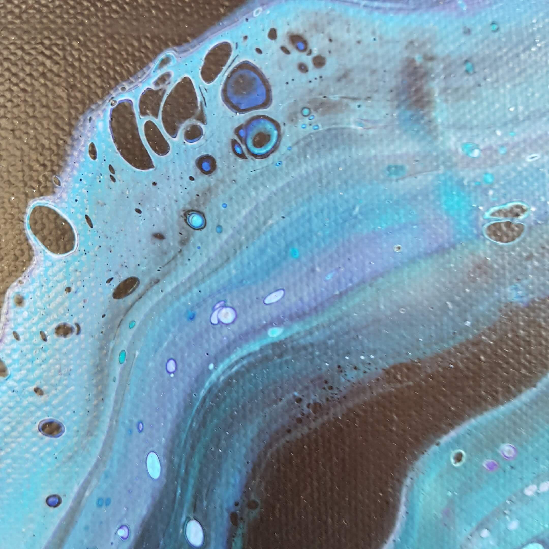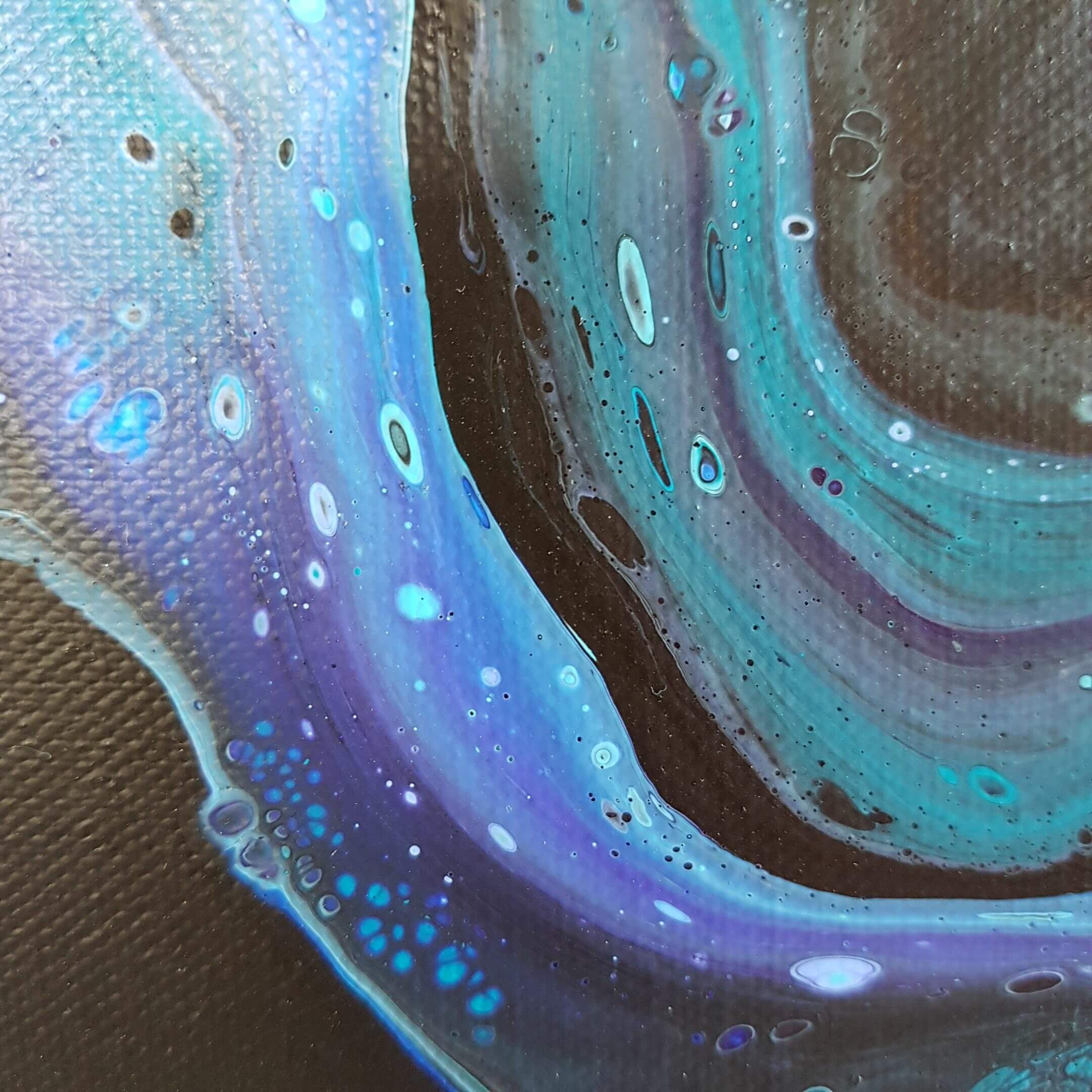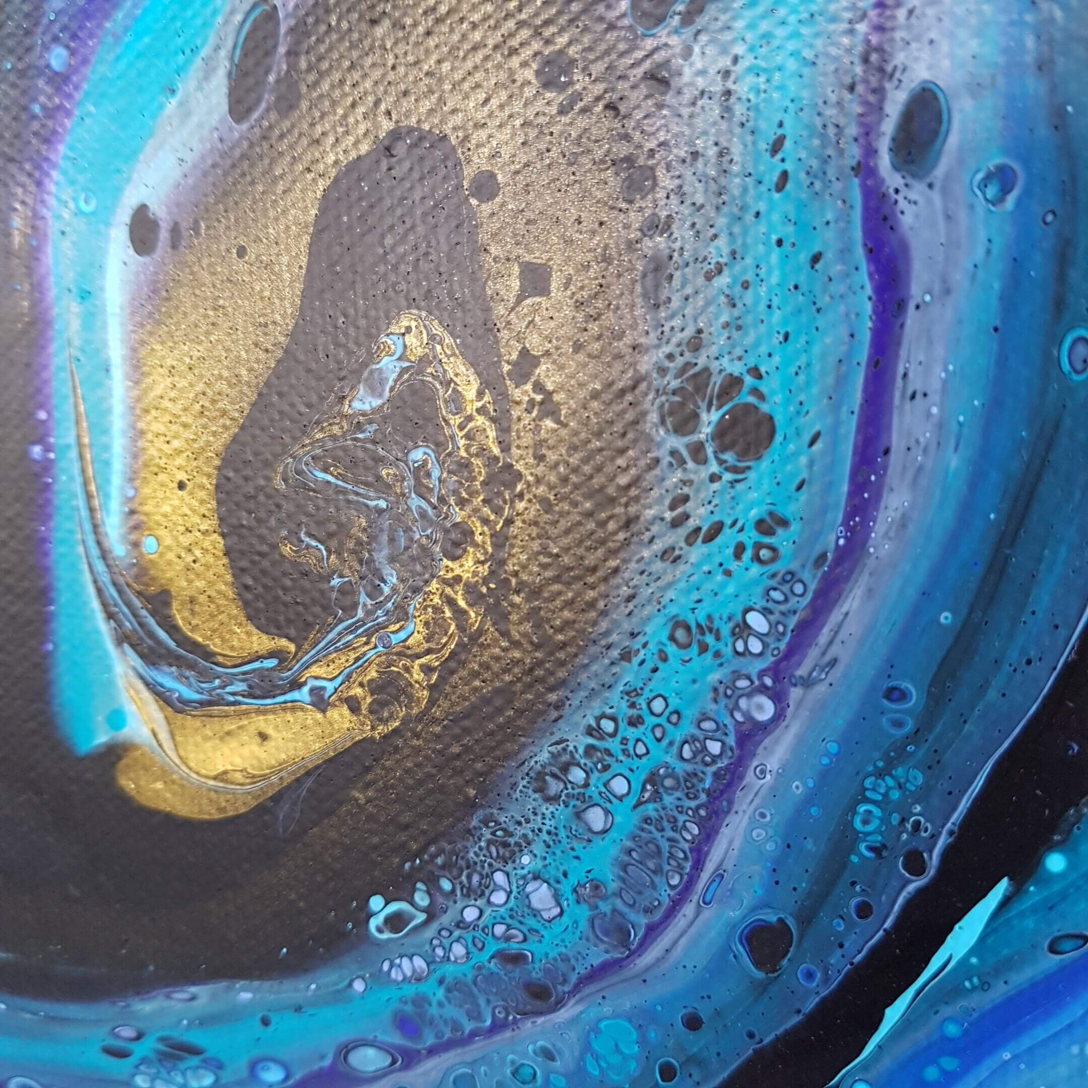 Réalisée avec la technique du pouring, cette œuvre acrylique sur toile coton dévoile une fascinante spirale de bleus profonds, de violet et de touches dorées. Les couleurs semblent se déployer comme un portail lumineux, un point de convergence entre énergie et mouvement. Les dégradés fluides et les petites cellules créent une texture mystérieuse qui évoque un vortex ou une galaxie en expansion. Grâce à son format 30×30 cm, ce tableau s’intègre facilement dans tout intérieur, apportant une atmosphère apaisante et cosmique. Chaque détail unique reflète la magie du geste et la poésie naturelle du flux de peinture.