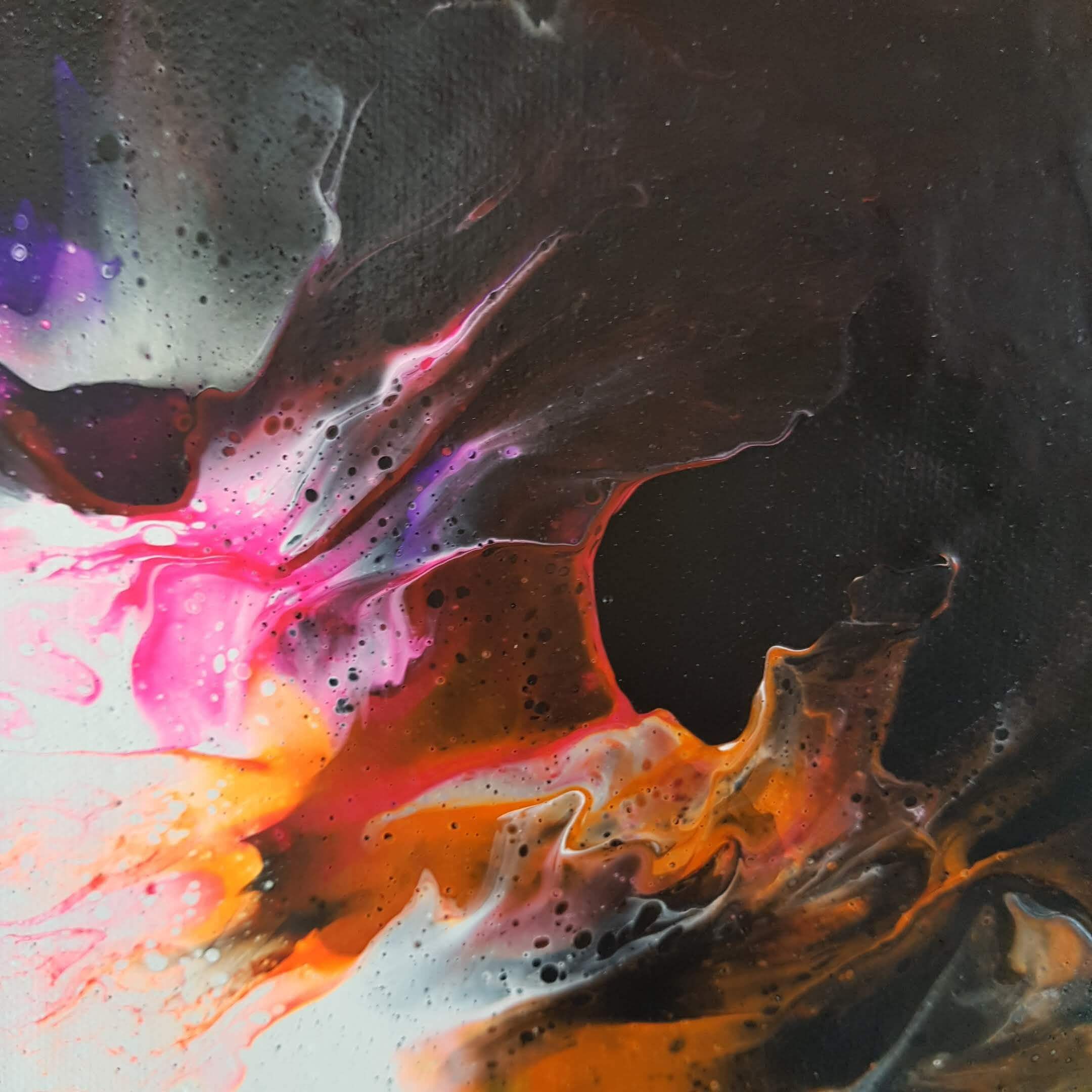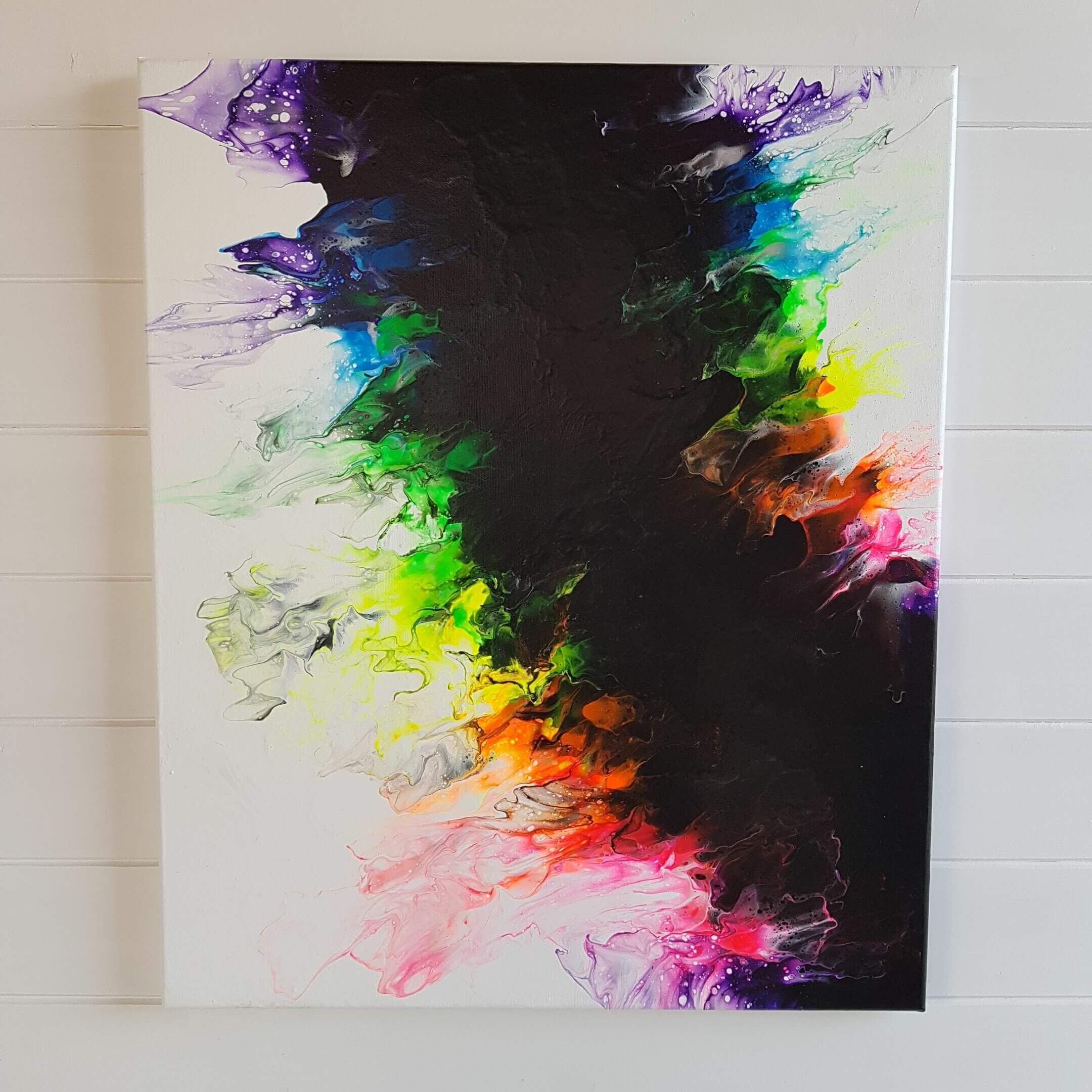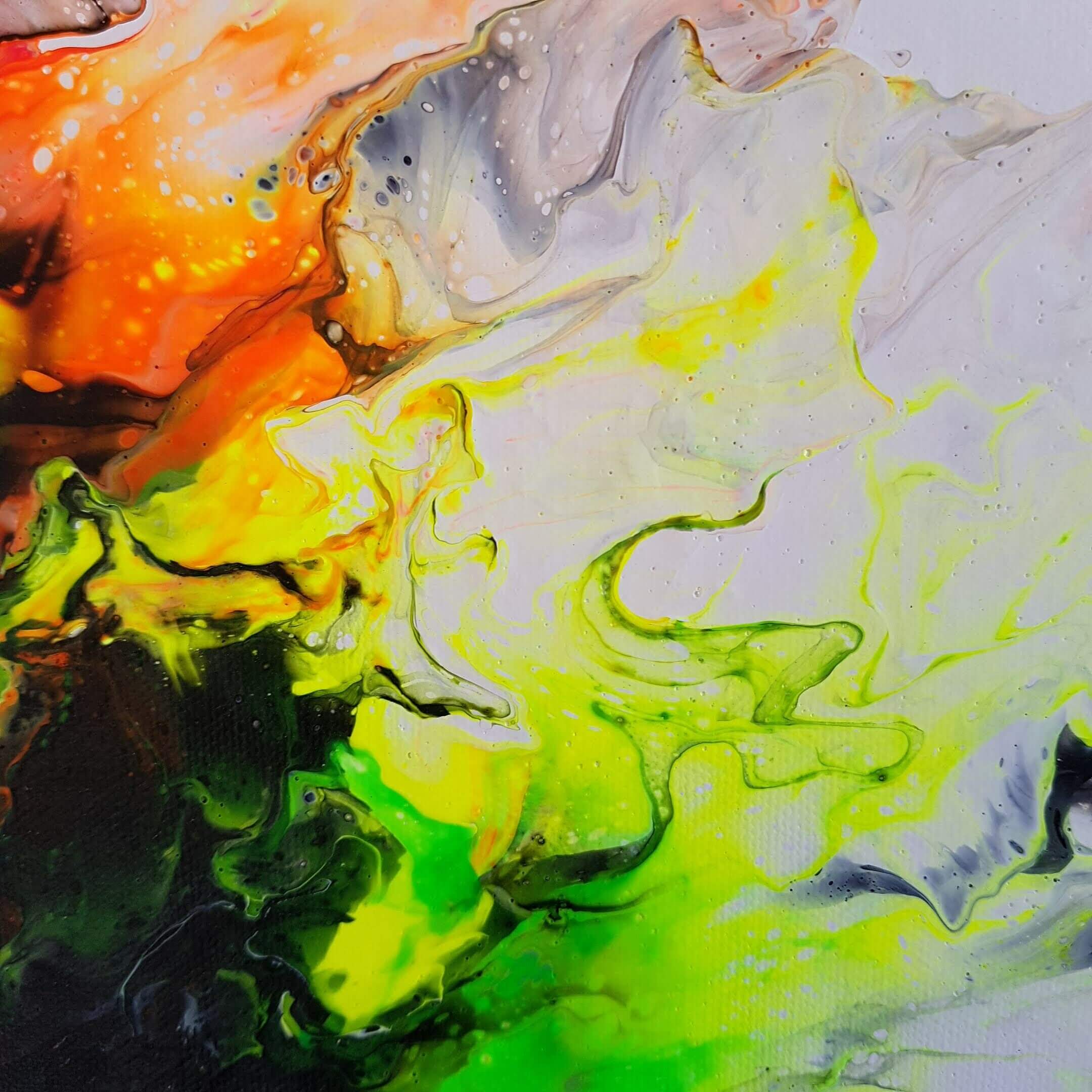 Créée à l’aide de la technique du pouring, cette pièce unique en peinture acrylique sur toile en coton tendue transporte les spectateurs dans un autre monde. Les couleurs fluos associées au noir et au blanc créent de profondes vibrations, tandis que la taille de cette peinture de 46 cm x 55 cm offre une multitude de possibilités d’exposition.